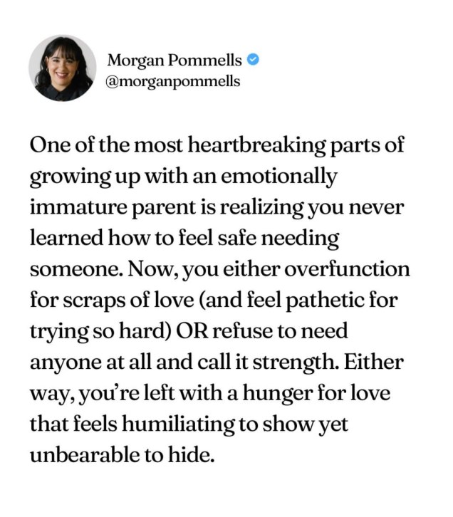 I don’t think going no contact necessarily comes from a place of ‘blaming’ our parents for our problems and then cutting them off – although I think it is often framed that way. It’s way more complex than that. Fundamentally, it is about relationship and rupture and damage that feels irreparable and making a conscious choice to step away from the pain even if it hurts to do so. Let’s be real, most of us want to be loved by our families and will do (and have done) almost anything to try and make the smallest breadcrumb of ‘love’ be enough… it really is the last straw when we can’t take it anymore and walk away. And whilst you might think that would feel a relief, actually it just opens up a whole load of extra grief about ‘what wasn’t but should have been’.