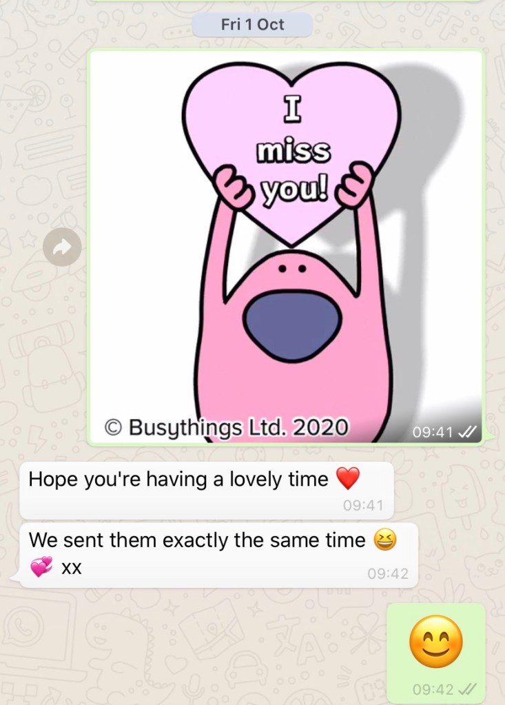 I had felt moments of really deep sadness and longing when I was away on the previous Friday (missing my session), not enough to not enjoy myself, but when I was sitting down alone waiting for my wife and kids I felt a real ache in my chest that I wasn’t able to be in the room that morning. I text Anita a GIF to say I missed her, and amazingly we both sent each other a message at the same time.