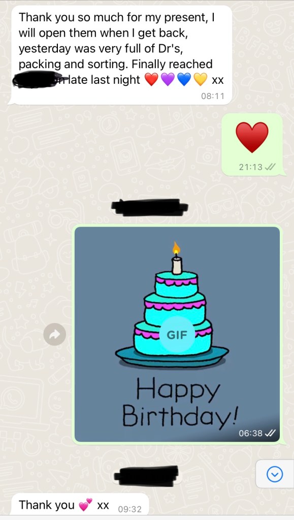 As you can see, I sent her a GIF on her birthday and then left her to it. Just over a week into her holiday A sent me a message with photos of her holiday: