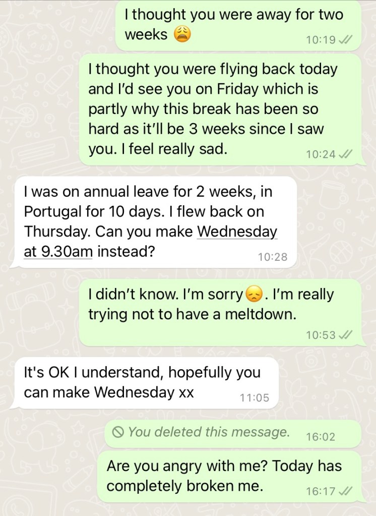 Yeah. It’s not fair. I really feel that. The fact she’s letting me go and other long term clients but not easy short term feels like the biggest kick in the teeth. I feel like she’s running scared. I know her so well and she can’t hide from me. Instead she’s run. It’s gutting. She says she loves me still and cares deeply… big how can she? You don’t do this to people you love… do you?