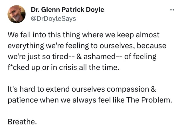 It’s hard reading her message because as much as it isn’t personal – it is . I am ‘Complex Trauma’ and apparently, it’s that (me) that is triggering her need to protect herself as a “survival mechanism”. I know she would be horrified to think I would read it in that way, but that’s basically what she’s saying. And ending with “deep emotional connecting work” isn’t an abstract concept. She ended with me. She abandoned me when we were right in the thick of the work because she just couldn’t do it. All the words of “It’s not what either of us want” and “I love you so much but I have to get well” feel utterly ridiculous don’t they?